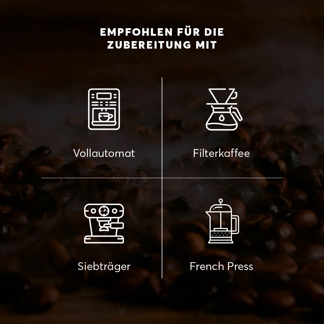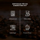 Am besten die ganze Bohne bestellen und immer frisch vor der Zubereitung für ihre gewünschte Zubereitung mahlen. Unsere gemahlene Variante ist perfekt für Filterkaffee oder auch French Press (Stempelkanne wie. z.Bsp. Bodum) geeignet.