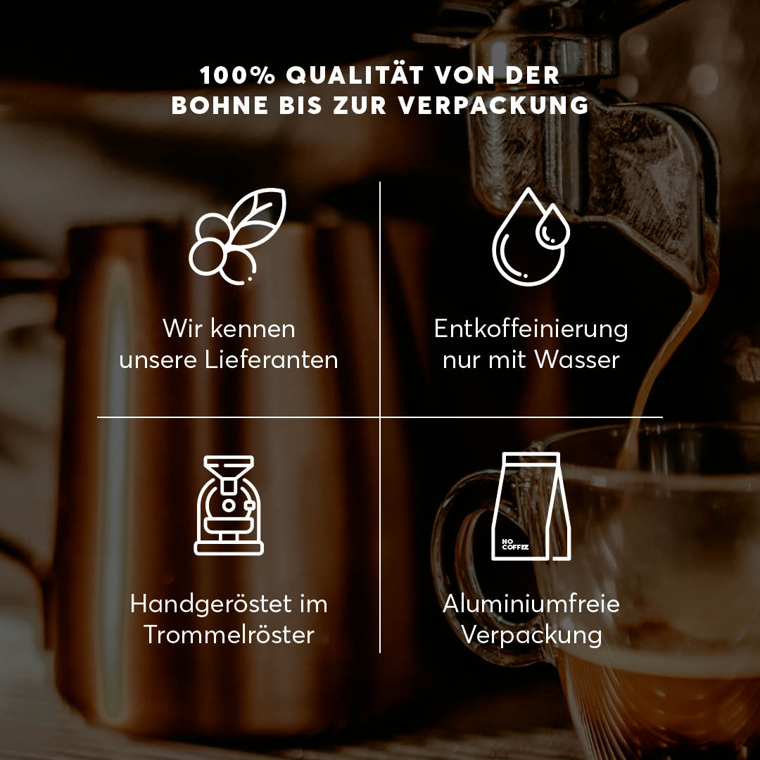 97% aller Kaffees werden mit Chemie entkoffeiniert. Dein No Coffee hingegen wird ausschließlich mit Wasser entkoffeiniert. Das ist nicht nur gesundheitlich 100% unbedenklich sondern sorgt auch dafür, das im Gegensatz zu allen anderen Kaffees, der Kaffee seine über 800 Aromen nicht verliert. Das Ergebnis: Der erste Decaf, der schmeckt!