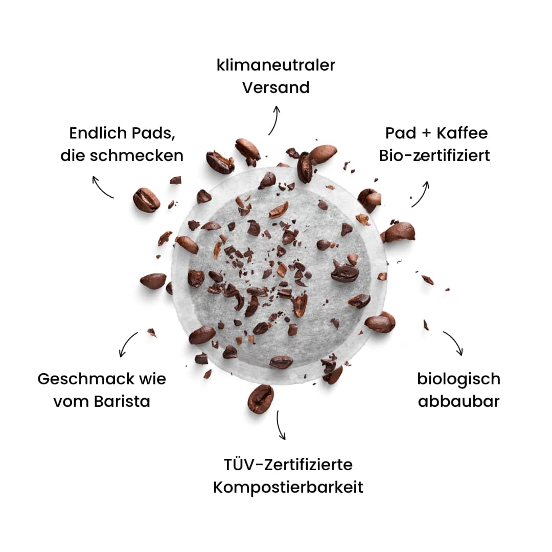 In allen Pads findet Ihr unsere Kaffee-Röstung. 100% sortenreine Bio-Arabica-Bohnen.